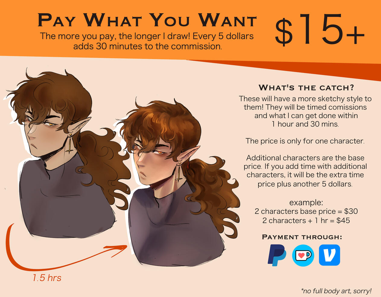 For the foreseeable future, I will be offering Pay What You Want commissions!If you're interested in this commission type, please fill out this Google Form.